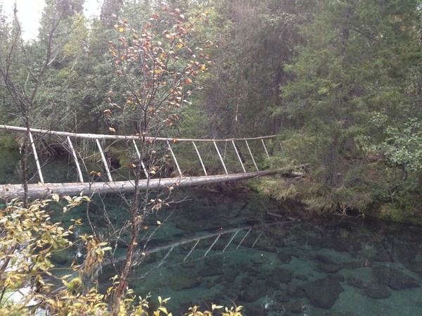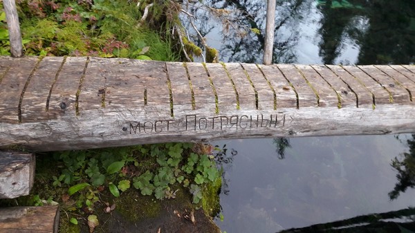 Обувь у нас была отнюдь не для болот, поэтому пришлось идти сквозь лесную чащу. На нашем пути возникло невероятно красивое озерко необычайного зеленого оттенка. Несмотря на зеленый оттенок, вода была кристально чистой. Дно было видно во всех направлениях. Набранная в бутылку вода не имела никакого оттенка от слова "совсем". Через озеро переброшен мост под названием "Потрясный". Неподалеку располагались еще два маленьких озера со столь же чистой водой.