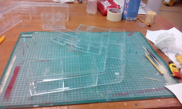 Она собирается из оргстекла, выпиленного на фрезе. Является каркасом для здания и одновременно стеклом для окон. То есть, лампа, помещённая внутрь коробки, будет замечательно подсвечивать изнутри окошки.