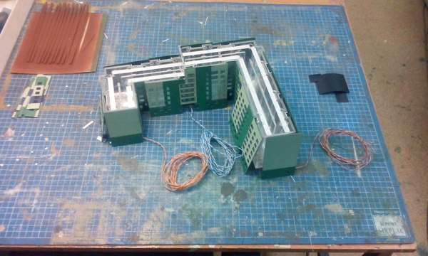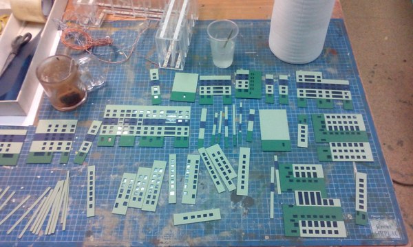 Фрезой вырезаны сами фасады из полистирола. Спереди он обтянут крашенной виниловой плёнкой, сзади - полупрозрачной тонировкой. Поэтому окошки светятся с выбранным оттенком. Ну, чтоб понятнее было: