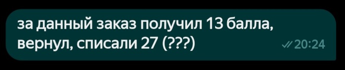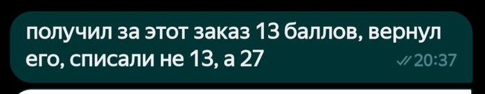 Когда я получил заказ, мне были начислены 13 баллов Плюса. Но когда я вернул его, заметил, что с меня списали целых 27 (хотя, логично, должны были только 13).