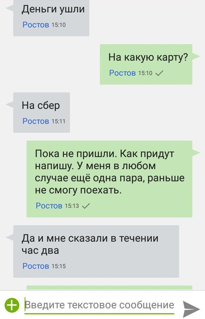 Он написал, что вроде как отправил деньги и что они придут в течение двух часов.