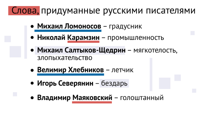 Новые слова изобретались писателями всегда. Благодаря Михаилу Ломоносову у нас есть слово «градусник», Николай Карамзин подарил русскому народу «промышленность» и «трогательный», Федор Достоевский – глагол «стушеваться», а Михаил Салтыков-Щедрин – «халатность».