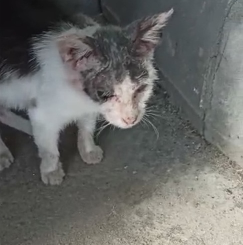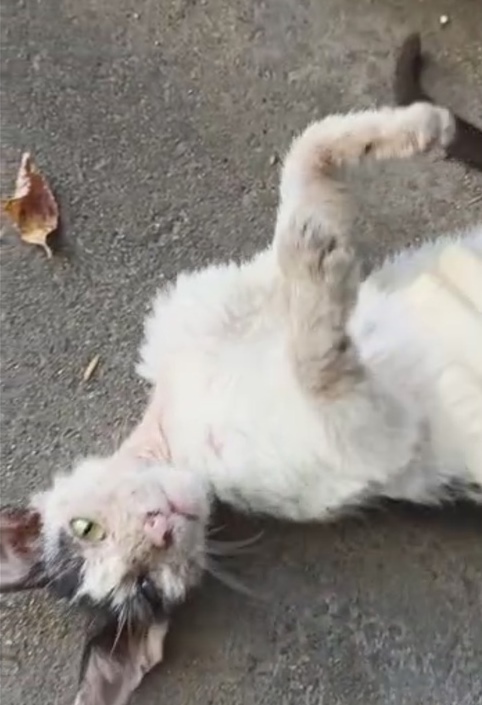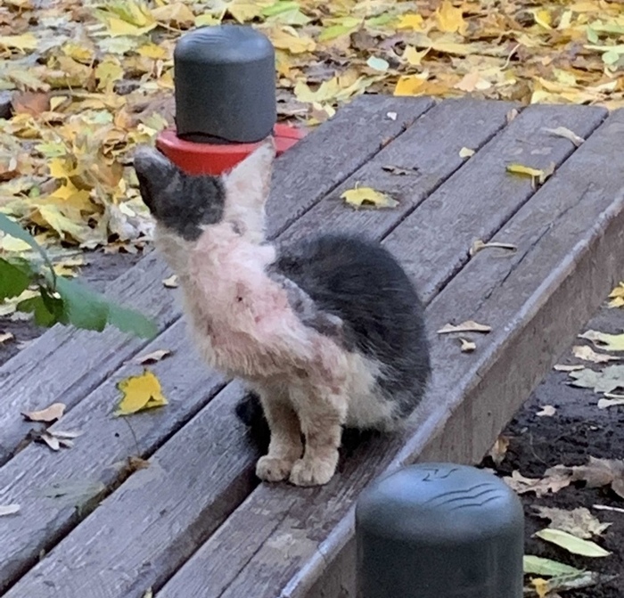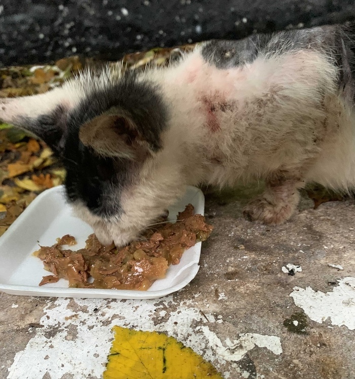 Бедняга весь полуоблезший, местами лысый - особенно шея, всё тело в расчёсах и запекшихся кровавых ранках... По словам жильцов дома, что подкармливают местный прайд, у котёнка скорее всего сильный блошиный дерматит или чесоточный клещ, а возможно и подкожный клещ тоже.