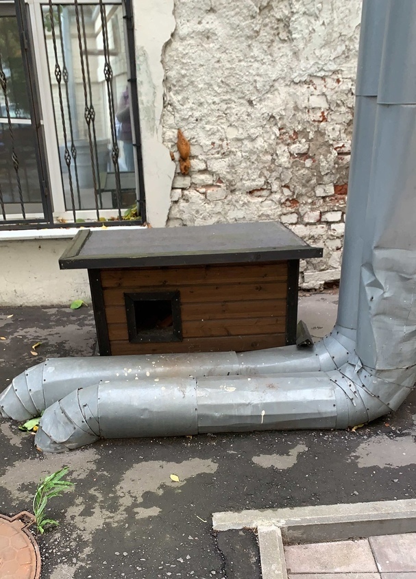 В углу между домами проходят трубы теплотрассы, там все котейки и обитают - но после зимы их всё равно остаётся не больше половины. Да, жители поставили рядом деревянный домик - только разве способен он укрыть голодных хвостиков от мороза?.. И сытые-то не все выживают...