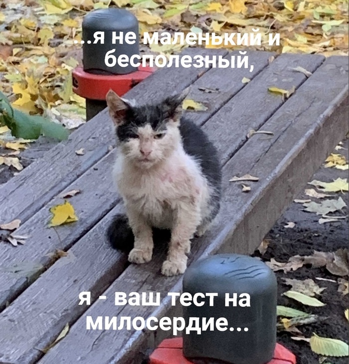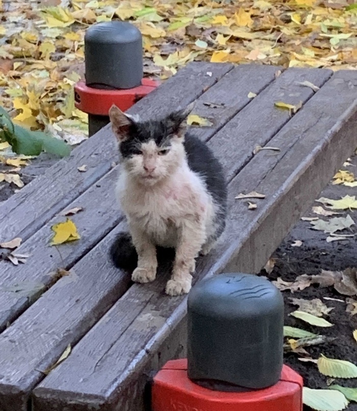...а иначе его трудно назвать... Котёнок-подросток - не понять, кто это - мальчик или девочка, по поведению больше на мальчишку похож. Но какой несчастный!.. Даже не то слово, смотрите сами -