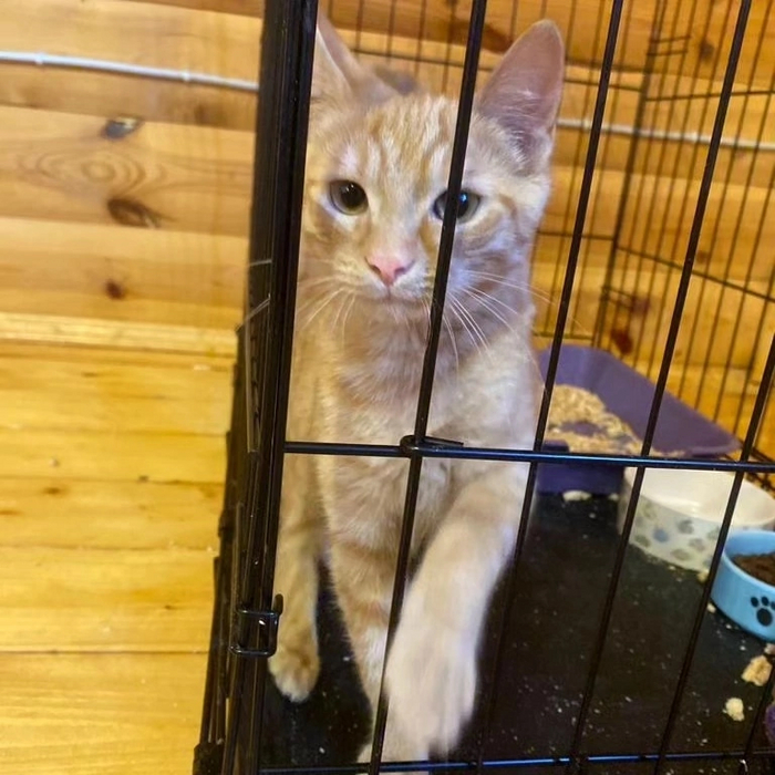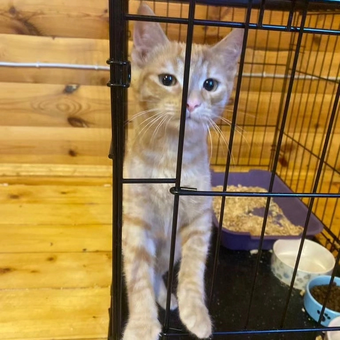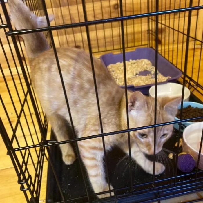 Пряника забрали из небезопасного места, где умирали кошки, но домашней передержки для него не нашлось, котенка поселили в клеточку