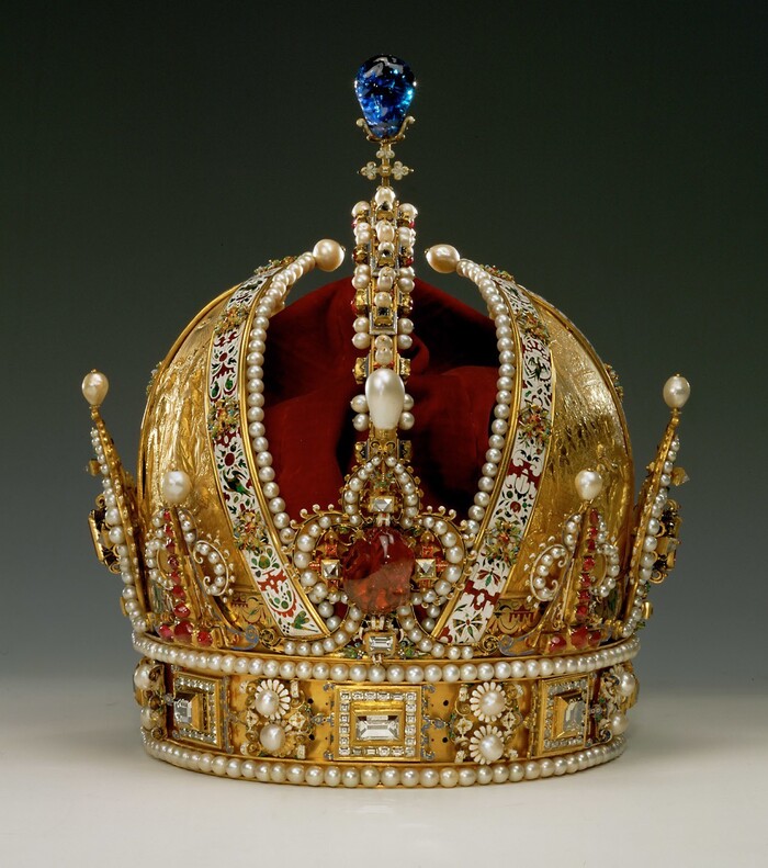 Корона императора Рудольфа II, позже корона императорской Австрии. Эта корона была сделана в 1602 году в Праге, как личная корона для императора Рудольфа II, который правил с 1576 года как император Священной Римской Империи. Золото, эмаль, бриллианты, рубины, шпинели, сапфир, жемчуг, бархат. Художественно-исторический музей Вены
