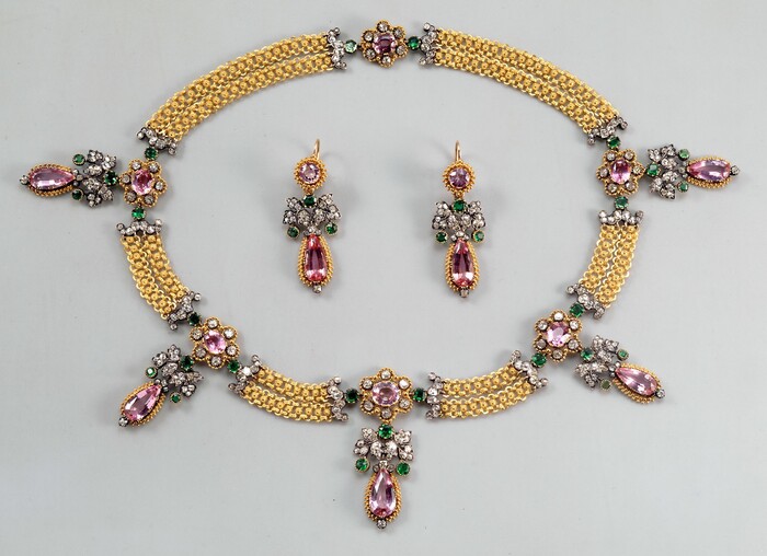 Ювелирный набор Эрцгерцогини Софии. Золото, серебро, бриллианты, изумруды и розовый топаз.Художественно-исторический музей Вены