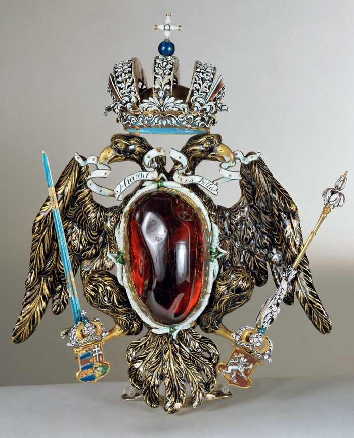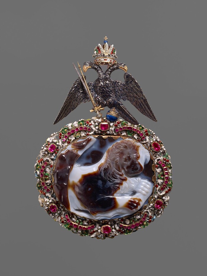 Камея "Лев" На вершине двуглавый орел с имперским скипетром, имперским мечом и шаром; он носит корону Рудольфа II, венец Габсбургов дома. Художественно-исторический музей Вены