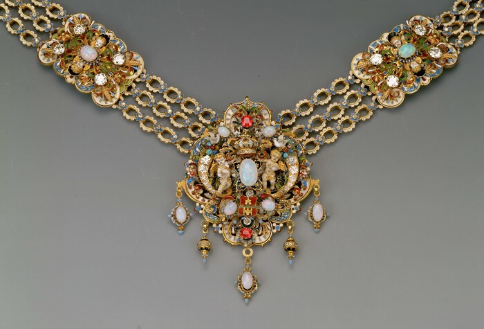 Венгерский опалшмак. По случаю своего брака с наследным принцем эрцгерцогом Рудольфом 10 мая 1881 года бельгийская принцесса Стефани получила в подарок набор ювелирных украшений из Будапешта. Художественно-исторический музей Вены