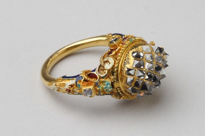 Кольцо с солнечными часами в виде ежика. Золото, эмаль, бриллианты (27 камней), стекло. Художественно-исторический музей Вены