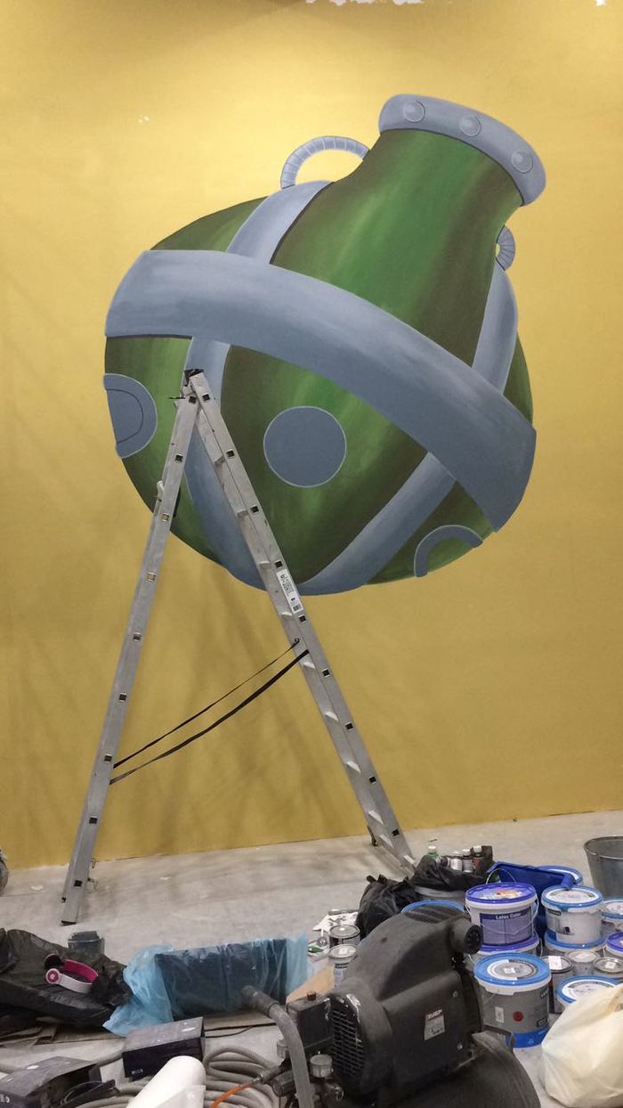 Эту зеленую колбу (размером 2 на 2 метра) и бирюзовый прибор (метра на метр) пришлось содрать и рисовать заново. Перед повторным рисованием все три стены (кроме уже расписанной) пришлось подготавливать заново, т.е зачистили всю краску, прогрунтовали, заново покрасили комнату и потом уже можно было приступать мне к работе. ( а сроки всё увеличивались...)