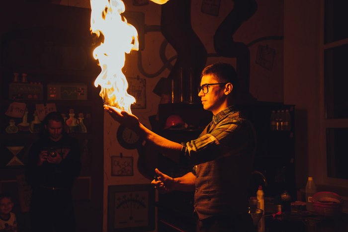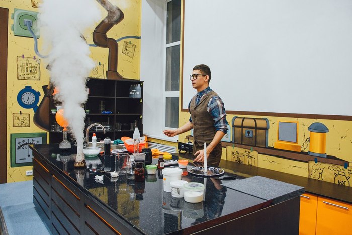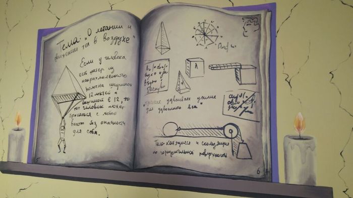 На плакатах нарисованы схемы Леонардо да Винчи, рецепты химических шоу, полезные формулы по химии и физики.