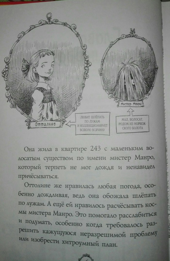 Всем привет ребята. В этой книге Крис Ридделл рассказывает нам историю о девочке Оттолине, ее родители странствующие коллекционеры, они ездят по миру, и собирают разные диковинки. А сама Оттолина живет с маленьким волосатым существом по имени мистер Манро. А еще они юные сыщики, и довольно часто разгадывают разные загадки. В этот раз они должны разоблачить шайку обманщиков- кем они оказались я вам не скажу (вдруг вы собираетесь прочитать, а я вам все расскажу, нет, так не интересно!)
