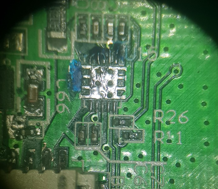 Ну что ж, сколхозим немного. Припаиваем на места обрывов проводочки, не забыв свериться с даташитом.