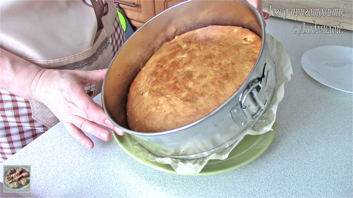 Готовый пирог должен хорошо зарумяниться. По началу верх его очень твердый, но по мере остывания пирога, верх его становится мягче. Вынимаю пирог из духовки, снимаю борта формы и даю пирогу немного остыть. Затем его переворачиваю, убираю дно формы и бумагу. Если нижняя поверхность пирога влажноватая, то можно оставить его в перевернутом виде постоять 10 - 15 минут, чтобы она подсохла. Затем пирог переворачиваю и даю ему полностью остыть. Лучше на решетке.