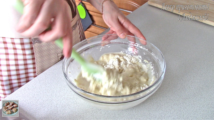 Тесто получается гуще, чем на оладьи, но не такое крутое, как на пироги.