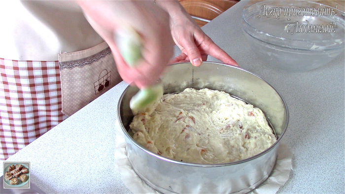 Подготовленное тесто перекладываю в разъемную форму диаметром 24 см. Дно формы я застелила бумагой для выпечки и смазала ее растительным маслом.
