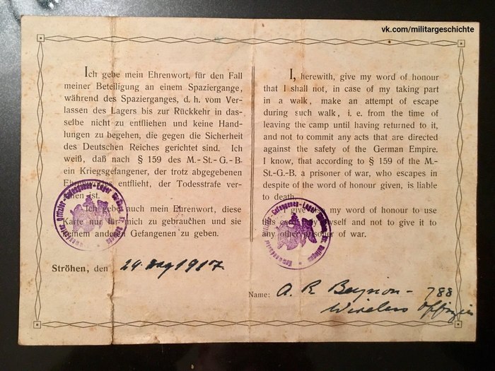 Клятва британского военнопленного о том, что он ни при каких обстоятельствах не будет пытаться совершить побег из немецкого лагеря, 1917.
