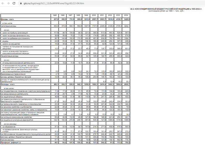 Я потратил примерно пару часов, чтобы самому посмотреть что происходило в стране в те годы в обсуждаемом вопросе. Данные я брал отсюда - Консолидированный бюджет Российской Федерации и бюджетов государственных внебюджетных фондов.