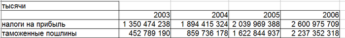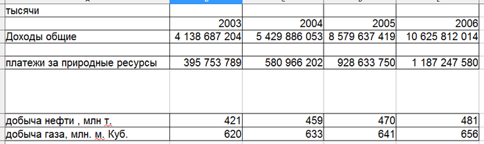 Первая строчка общее значение, ну и собственно все что ниже составляющие элементы. Но по сути, если посмотреть на строчку с кодом "1050300 Налог на добычу полезных ископаемых", видно что по сути она и есть самая основная из всех перечисленных по объему денежных отчислений. В общем беру заношу все в таблицу, получаем вот что: