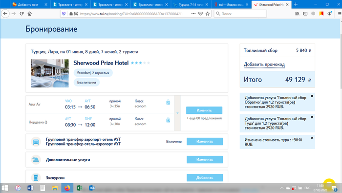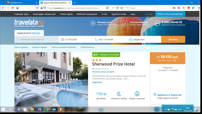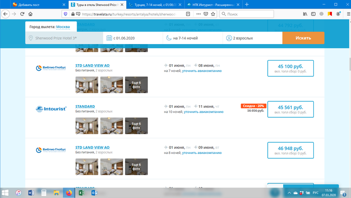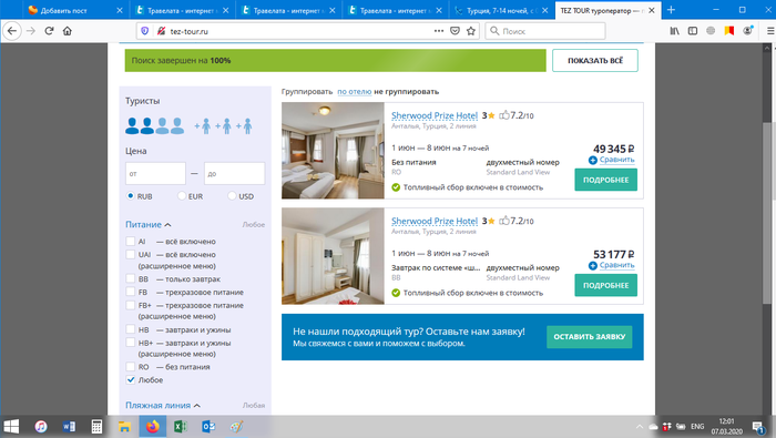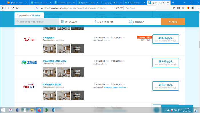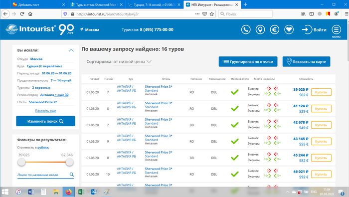 Запросим любой отель. Я запросил случайно выбранный Sherwood Prize в Турции с 01.06.2020 на 7-14 ночей, 2 взрослых