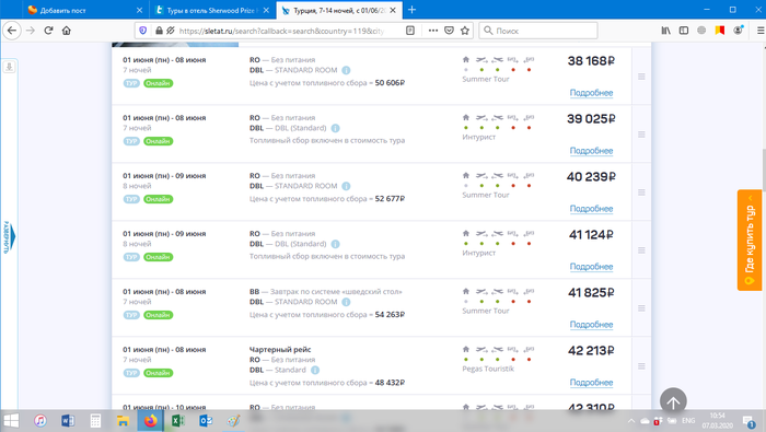 Видим тот же самый тур за 38 168 р. И тут вроде бы следовало завершить наше расследование, но особенность этого сайта, что цена с топливным сбором указывается в среднем столбце. И там мы видим 50 606 р. Поэтому для точности сравнения отсортируем по Интуристу и видим этот же тур за 39 025 р.