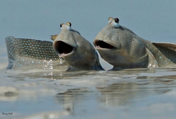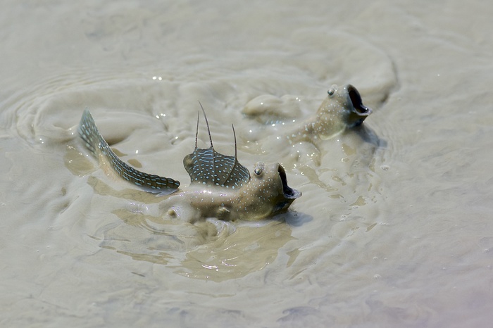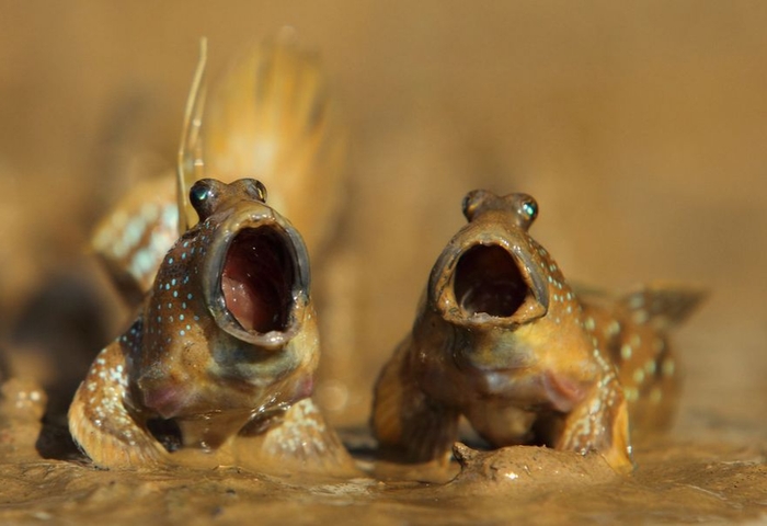 На этом снимке, сделанном в гонконгском болотном заповеднике Маи По, самцы синепятнистых илистых прыгунов (Boleophthalmus caeruleomaculatus) сражаются друг с другом за территорию. Снимок победил на фотоконкурсе Лондонского королевского общества Royal Society Publishing Photography Competition 2019 в категории «поведение» (Behaviour).
