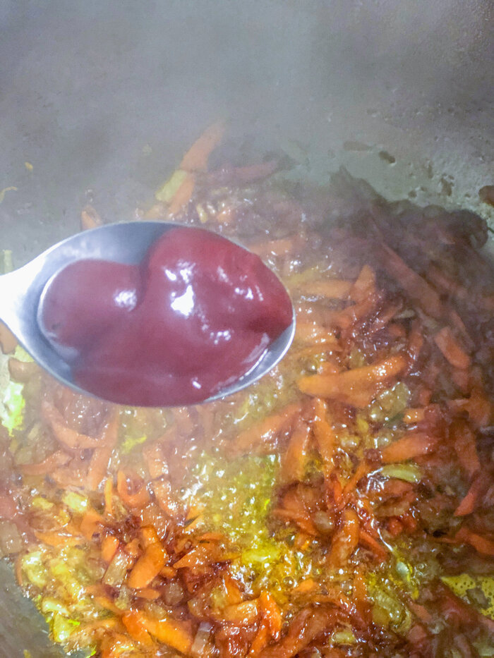 Перемешиваем и наливаем 2- 2,5 литра воды ( можно добавить рыбный , овощной, куриный бульон или 1:1 ( вода + любой из бульонов))