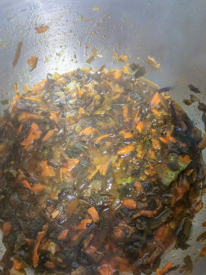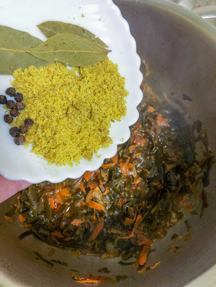Обжариваем её минуты 2 , добавляем морскую капусту, предварительно слив с неё жидкость , после добавляем специи