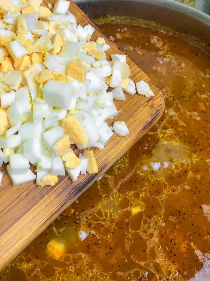 Как только картошка, рис готовы, добавляем нарезанные яйца и зелень