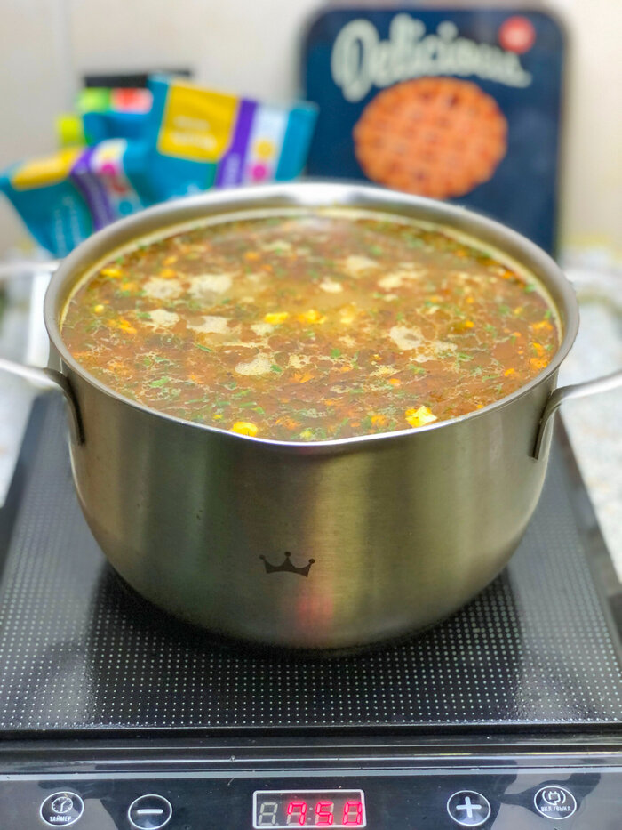 На медленном огне наш суп варится ещё 5 минут --> выключаем конфорку, накрываем крышкой и даем немного отдохнуть блюду. Продукты 20 минут должны пообщаться друг с другом ☝... Наш Суп готов !