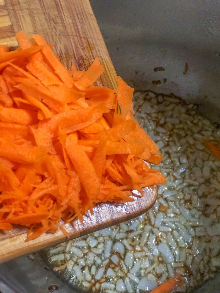 В разогретую кастрюлю, в которой мы будем варить наш суп , наливаем растительное масло и добавляем мелко нарезанный лук . Лук стал прозрачным и немного поджарился , к нему добавляем, натёртую на крупной тёрке, морковь