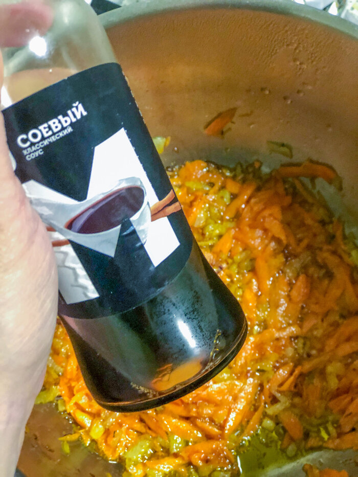 Добавляем 1/ 3 стакана воды и тушим 5 минут на медленном огне.