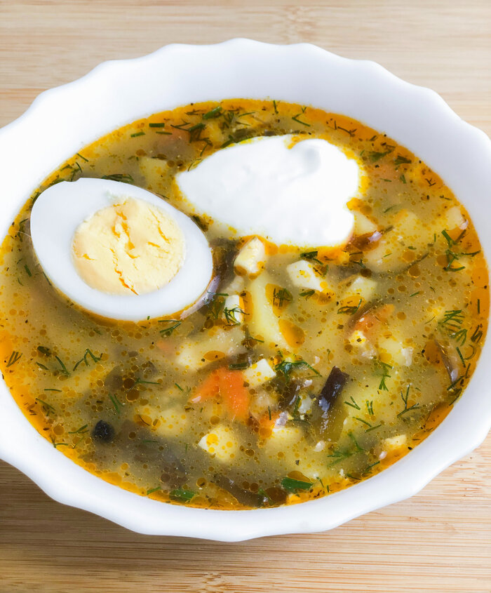 Разливаем его по тарелкам, добавляем ложку сметаны или майонеза , украшаем яйцом, по желанию и подаём к столу