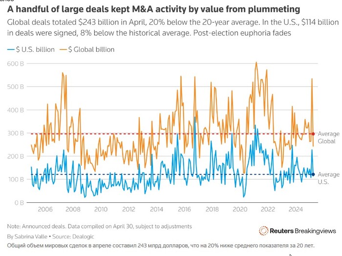 Вообще-то финансисты ожидали, что 2025 год при Трампе, радеющем за интересы бизнеса, станет звездным для слияний и поглощений. Но подписание сделок по всему миру резко грохнулось до 2330 сделок в апреле, что является самым низким показателем с февраля 2005 года и на 34% ниже исторического среднего месячного показателя.