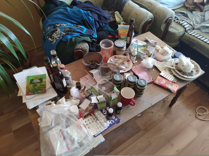 И вот такая хрень по всей квартире. На кухне в мойке посуда не пойми какой давности вперемешку с окурками. Из холодильника вонь неимоверная. На столе в зале бутылки из-под бальзама 45° крепости. Что самое интересное мама всегда одета в чистое, запахов неприятных нет, общается адекватно.