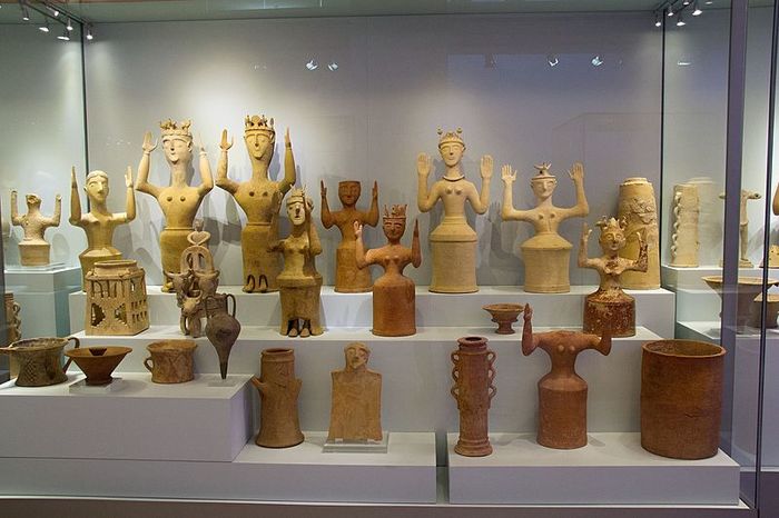 Самая поздняя группа подобных находок – так называемые минойские маковые богини. Это терракотовые фигурки, изображающие толи богинь толи жриц с воздетыми руками. От раннего образа остались длинная юбка, обнаженная грудь и корона. Но змей практически нет. У нескольких фигурок на короне птицы (возможно, голуби), у большинства – маковые головки. Учитывая, что в греческих мифах мак был растением Гипноса, бога сна, предполагается, что эти фигурки изображают богиню сна или, возможно, богиню смерти. Второй вариант более вероятен, если вспомнить, что изначально у минойской богини главным атрибутом были змеи, универсальный символ смерти и подземного (иного) мира.