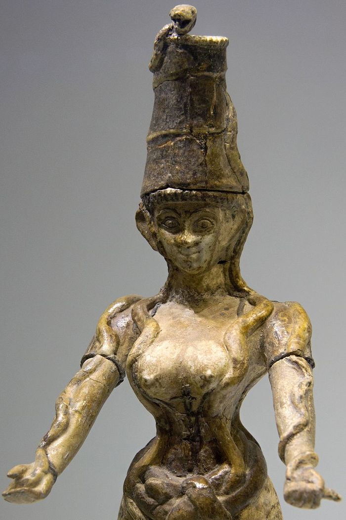 Есть несколько артефактов, обнаруженных в Кносском дворце, которые, как предполагается, изображают Богиню-змею. Среди них особенно выделяются две фигурки, открытые Артуром Эвансом. Бо́льшую фигурку он назвал Богиня змей/Богиня-змея, меньшую – Жрица змей. На этот счет до сих пор ведутся споры. Возможно, обе фигурки изображают богиню, либо наоборот – обе изображают жриц. А может это два разных женских божества. В дальнейшем было найдено еще несколько похожих артефактов и изображений женщин, одетых так же, как фигурки, обнаруженные Эвансом. Все они имеют характерную длинную юбку, рубашку с коротким рукавом, обнаженную грудь и высокую корону. Также все они держат в руках змей.