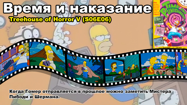 Время и наказание — новелла обыгрывает рассказ Рея Брэдбери «И грянул гром». Сломав свой тостер, Гомер берётся за его починку. Напихав в него что попало, Гомер превращает свой тостер в машину времени и телепортируется во времена динозавров. Там он меняет будущее, случайно раздавив комара. Возвратившись домой в своё время, Гомер видит, что мир сильно изменился и единственным выходом из этого положения является возвращение в доисторические времена…