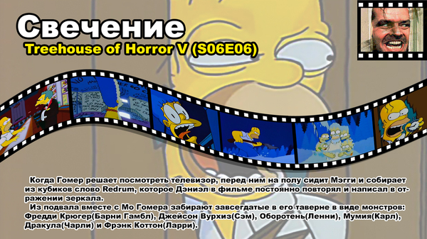 Новелла обыгрывает фильм «Сияние» Стэнли Кубрика, снятый по роману Стивена Кинга. Симпсоны приезжают сторожить на зиму особняк мистера Бёрнса в горах. Мистер Бернс и Смитерс забирают всё пиво из дома и отключают телевидение, чтобы новые жители не расслаблялись. Без телевидения и алкоголя Гомер постепенно сходит с ума. Мечтая о стакане пива, он видит монстров в образе: призрака Мо, мумии Карла, оборотня Ленни и демона Барни, которые заставляет Гомера перерезать семью. Гомер начинает свою охоту на родных в особняке мистера Бёрнса.....