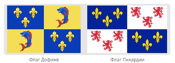 Правда, касаемо флагов Аквитании и Нормандии, где львы стоят на трёх лапах и повёрнуты «лицом» к зрителю, их скорее стоит называть леопардами, так как классическими геральдическими львами считаются только стоящие на двух лапах в профиль. В этой же группе, а точнее на флаге Лионне, появляются геральдические лилии, о которых поговорим чуть позже.
