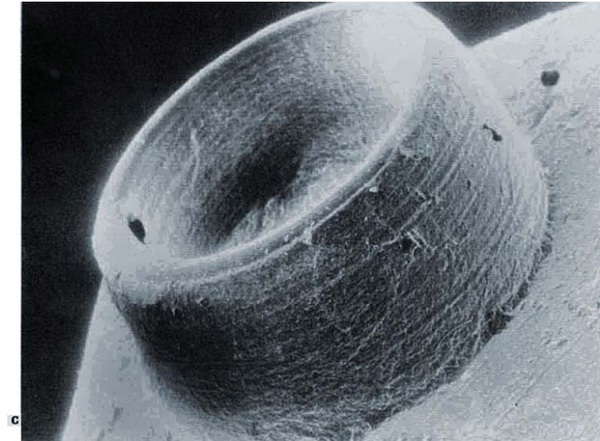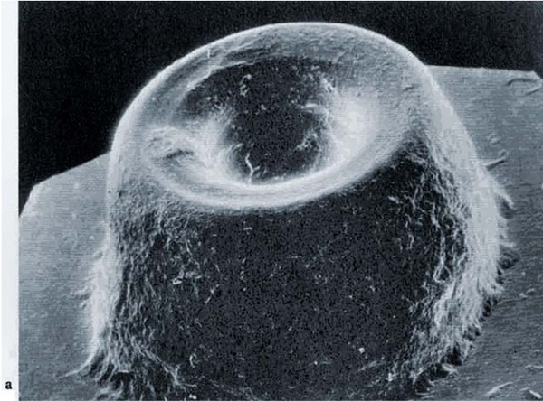 Рис.7а-d. Микрографии (увеличение 8 раз) слепка отверстия, сделанного трубчатым сверлом, позволяющие одновременное исследование внутренней стенки, наружной стенки и зоны режущей кромки. На рис. (а) в качестве абразива использовался сухой песок. Отметим, что стенки, внутренние и внешние, шероховаты. На них нет линий.