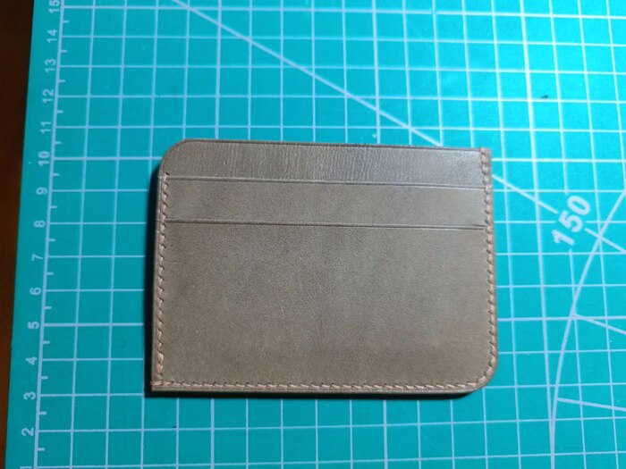 Кожа с неплохой восковой отделкой, поэтому пропитывать бальзамом и маслом нет необходимости. Но т.к. это картхолдер, хочется задать больше плотности основным деталям. Для этого наношу средство для бахтармы и располировываю. Повторяю 2 раза для желаемой плотности