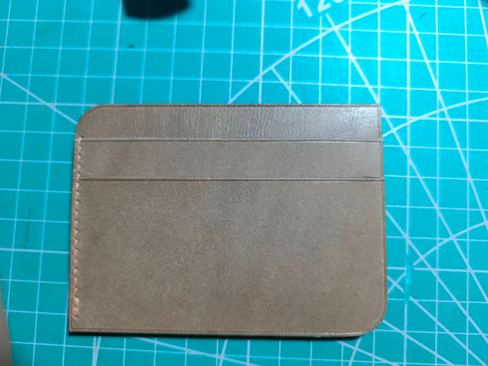 Дальше идёт обработка торцов после пошива, небольшая формовка карманов. И картхолдер готов