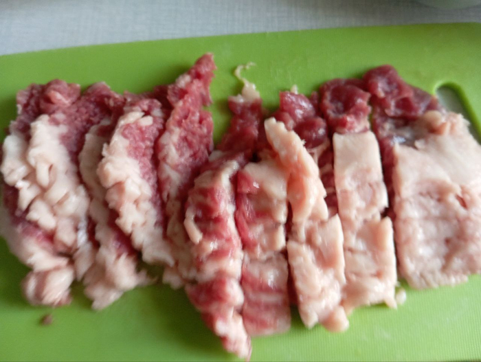 А сегодня возникла такая мысль: в мясном отделе если и есть мясо подходящее для бефстроганов, оно либо жесткое либо совсем нежирное. А мы мужики любим жирное мясо, и купил я суммарно пол кило "мраморного" бекона и нежирного антрекота. Ушло на всё меньше 500 рублей. А продукта получилось на всю сковородку.