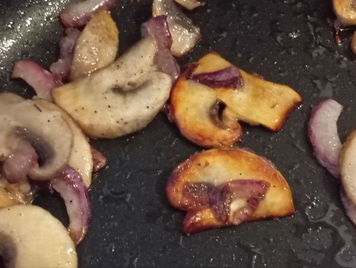 Спросите нафига лук и грибы отдельно? Потому что я люблю чтобы лук и грибы были примерное вот такой прожарки перед тем как я кину их в мясо тушиться