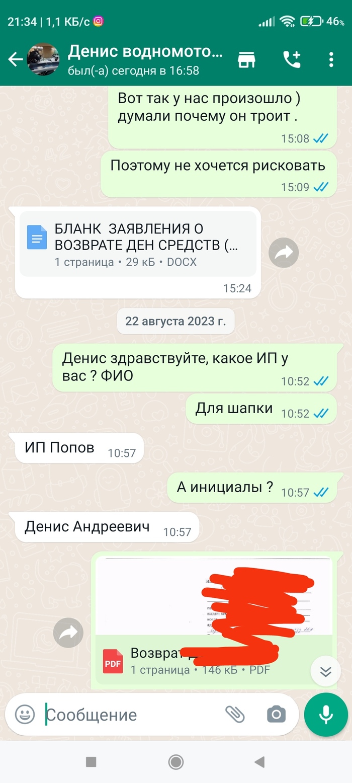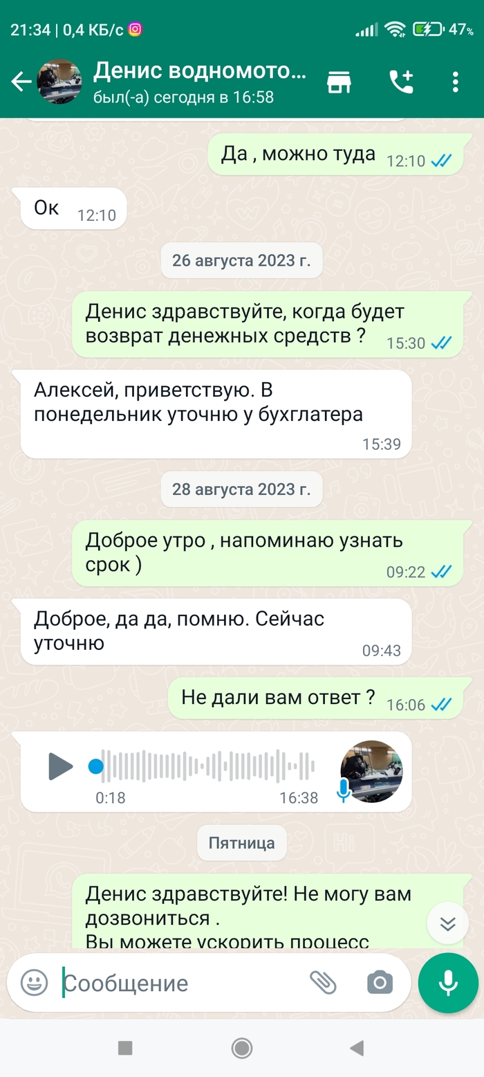 В понельник 21 августа получаю видео от Дениса , что все ок , мотор работает . я соглашаюсь на полную оплату, и вдруг Денис кидает видео, что мотор работает нестабильно , его трясет и вообще хз что происходит с ним . Конечно же я отказываюсь от покупки и прошу вернуть предоплату . Менеджер Денис сначала долго и упорно предлагает мне другие варианты мотор ( китайскую фигню , но я упорно парирую и отказываюсь , говорю мне нужен именно тот , который изначально оплачивал или возврат денег . ) Денис просит заполнить заявление на возврат средств . Начинается странное : В шапке заявления просят указать: ИП Попову Денису Андреевичу ( а платил на карту Федорову Денису Алексеевичу ) созвучно ? Совпадение ? Подозрительно ! Ладно , пишу заявление ( а что делать ещё ? ) 22 августа отправляю Денису , он заверяет что передает его в бухгалтерию . Сижу жду пару дней , денег нет ... Начинаю звонить , писать - Денис уверяет что все ок , бухгалтерия в Москве , долго решает , он не причем , но в целом типо все ок , не паникуйте , это норм . Проходит ещё пару дней , начинаю нервничать, читать отзывы в сети более тщательно ....исходя из отзывов контора часто долго возвращает деньги ...и в целом обманывает народ , берут предоплату , товар не продают и пытаются втюхать другой , более некачественный товар . Их кредо - главное взять любыми способами предоплату , а далее обрабатывать клиента . И максимально долго не возвращать деньги . Так же заманивают низкими ценами и не отдают этот товар под любыми поводами , предлагают другие. Через неделю пытаюсь ещё раз дозвониться до Дениса ... Не берет трубку . Дозваниваюсь до первого менеджера Алексея . Тот заверяет меня что все ок , Денис теперь в отпуске . Алексей контролирует ситуацию. И скоро деньги будут . Но как вы понимаете , кроме красивых слов вежливости - денег нет . Несколько раз звонил на горячую линию - один оператор пытается соединить меня с бухгалтерией - но там не отвечают и мне перезвонят ( спойлер - никто так и не перезванивал ) . В другой раз оператор говорит , что никто кроме моего менеджера мне не поможет , надо общаться ним.