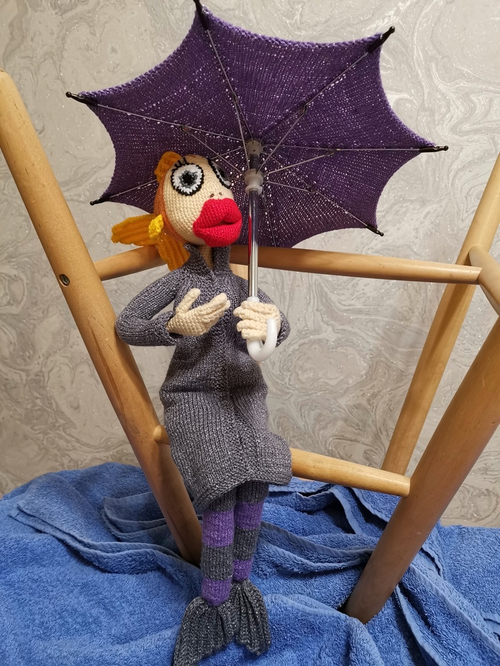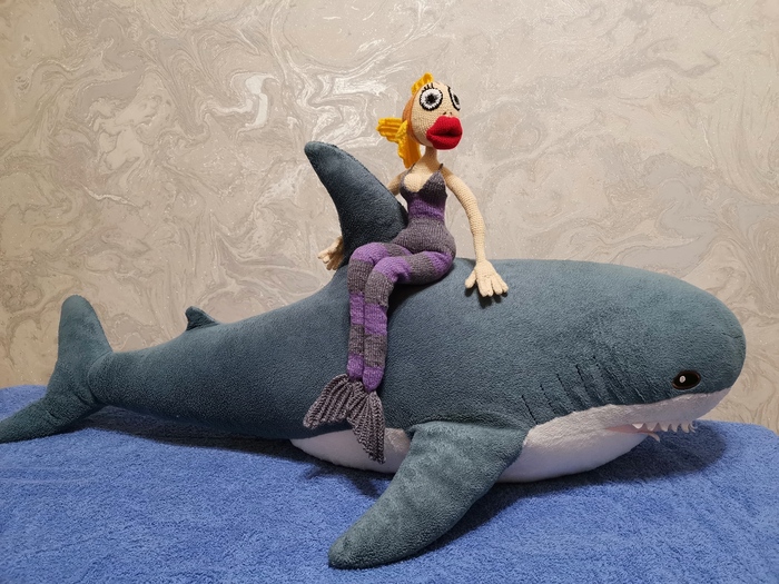 Год назад, когда кипиша по поводу "правильных" русалок даже и не намечалось, попросил меня муж связать ему русалку с сиськами. Ну ладно, с сиськами, так с сиськами... Сначала предложила ему в качестве образца русалку из "Богатырей". Сказал, что слишком жирная. Долго припоминала всех русалок, но в основном у них сиськи были не очень... А потом вспомнила настоящую армянскую русалку (муж наполовину армянин). Продумала образ, закупила ниток и... отложила все это нафиг на целый год. Летом вспомнила, что надо бы порадовать мужа и начала ковырять отложенные ниточки крючком. Работы на работе было много, перерывов на вязание было мало... Когда что-то наковыряла, пришел черед ненавистных мне спиц. Еле-еле успела доделать русалку ко дню рождения мужа. Кипишь вокруг русалок начался где-то в середине моего вязания русалки. Накаркала, наверное...