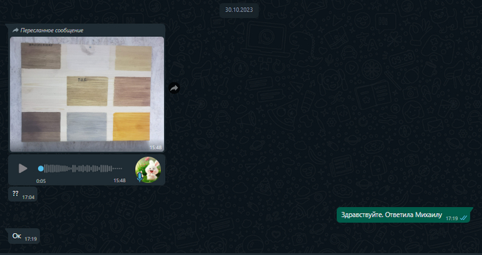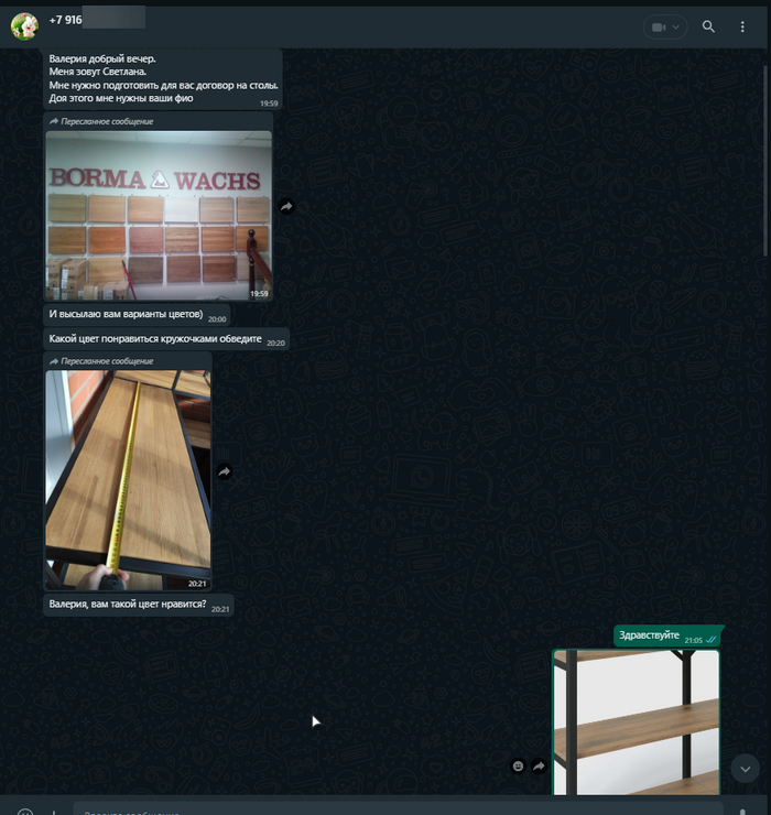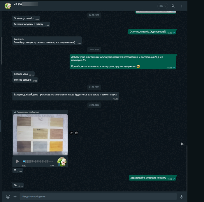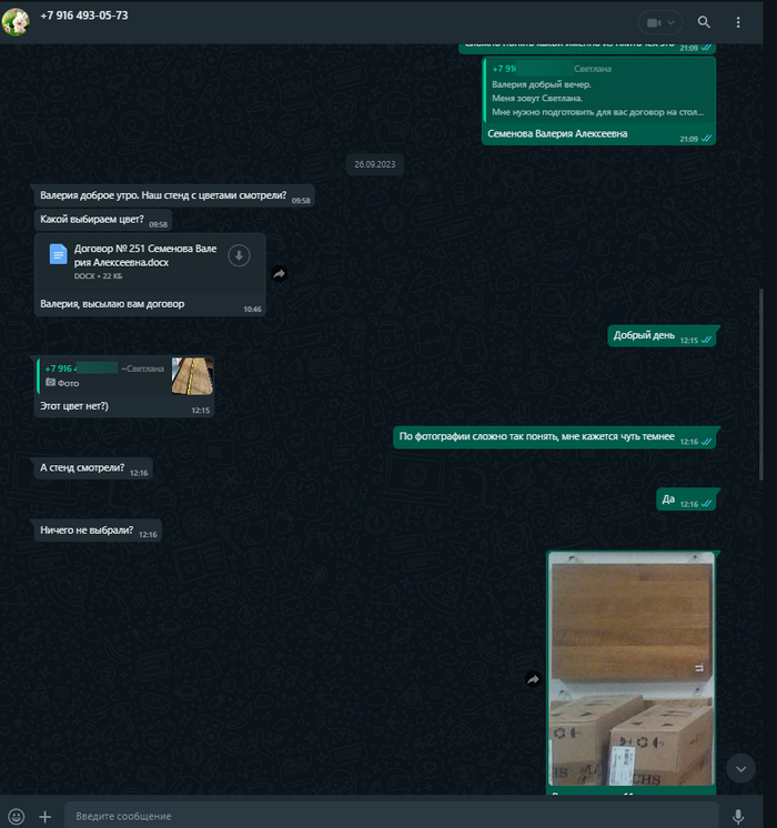 Дальше переписка перетекла в WhatsApp к той самой Светлане, которая на удивление быстро составила мне договор, прислала цвета на выбор и ждала чек с предоплатой. Т.е с Михаилом мы списались 25 Сентября вечером. Предоплату я внесла 26 Сентября, в день когда мне скинули договор.